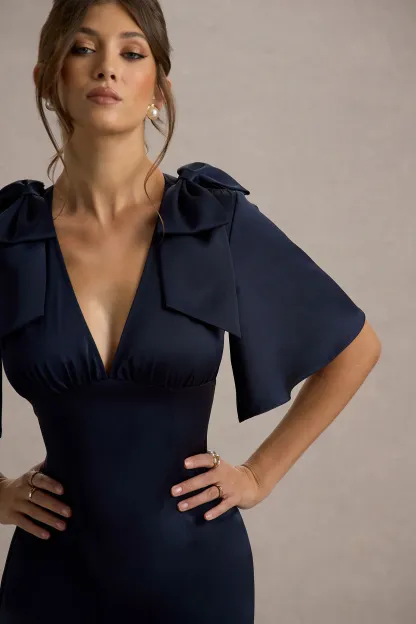 Whether you're attending a summer wedding or getting races ready. Danna is an elegant choice. Conjured up in a stunning blend of opulence and modern design. this navy midi dress is detailed by a classic v neckline. flutter sleeves and eye-catching bows that sit artfully upon your shoulders.