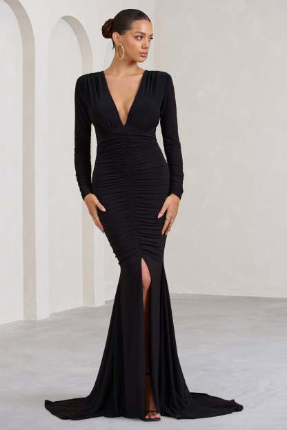 Demure Black Ruched Long-Sleeved Split Fishtail Maxi Dress