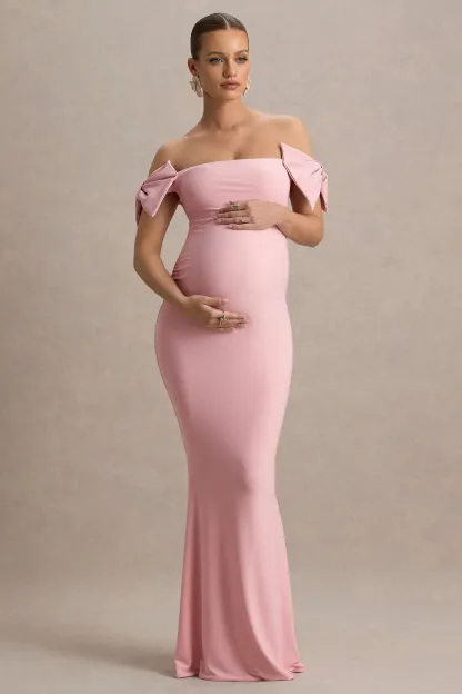 Pink Bardot Bow Detail Maternity Maxi Dress