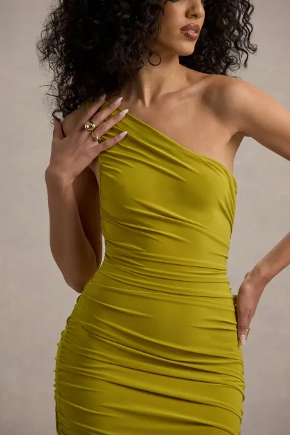 Green One Shoulder Asymmetric Ruched Midi Dress