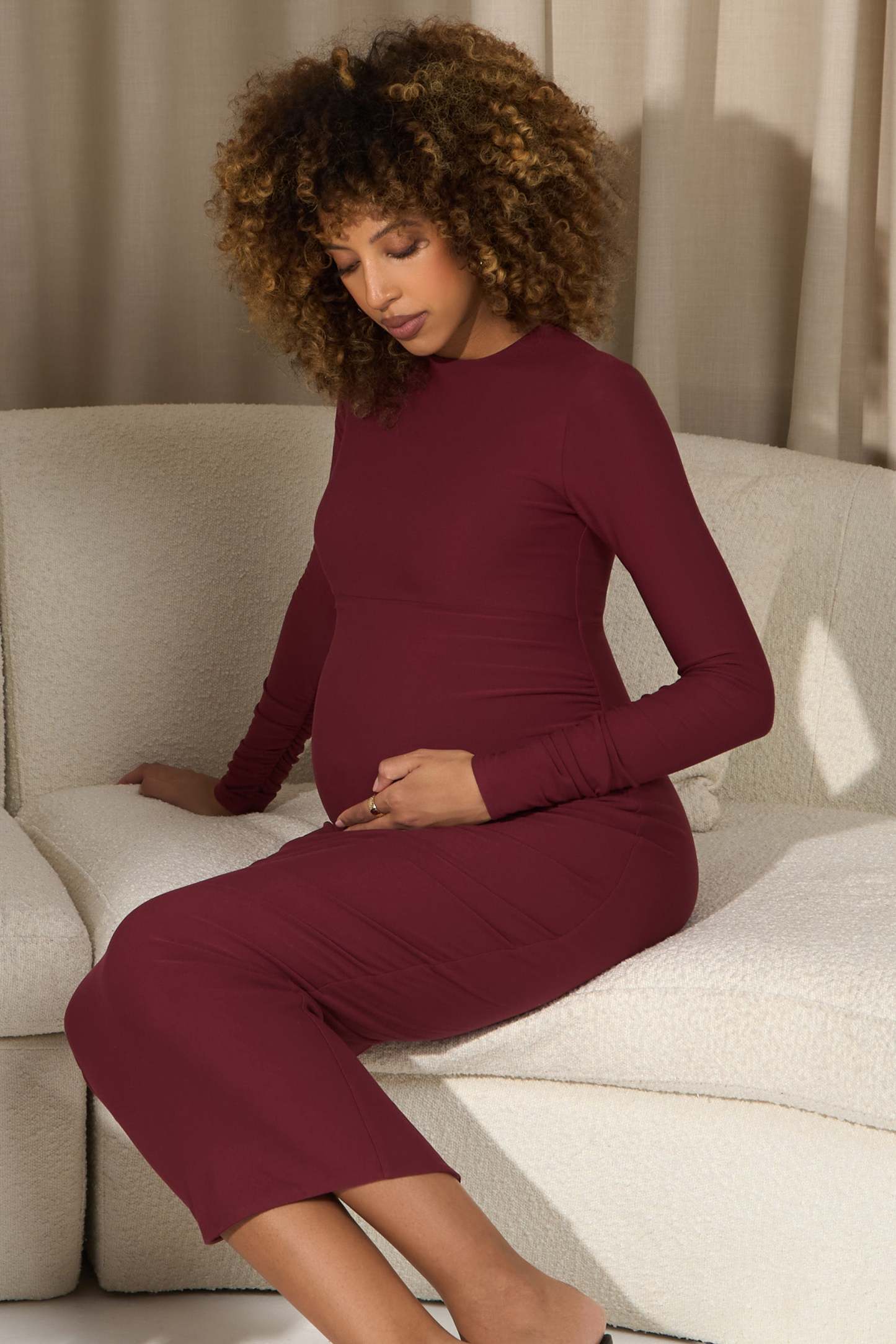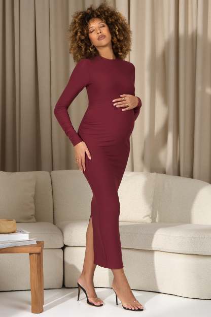 Curate a wardrobe of premium maternity basics starting with Dove. Designed in a rich berry shade. this long-sleeve maxi is cut from a super soft brushed jersey that effortlessly caresses each curve. Complete with subtle bump ruching and a functional split hemline for ease of movement. Dove is the perfect day to night piece.