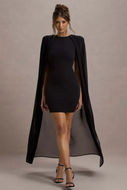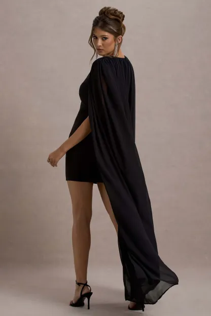 A show-stopping piece guaranteed to leave a lasting impression. add Elysium to your wish list this season. Framed in a bodycon silhouette of our premium stretch crepe. this mini dress boasts subtle shoulder padding to further elevate its shape. Complete with an extravagant chiffon cape that flows freely behind you. compliment this LBD with minimal accessories at your next event.