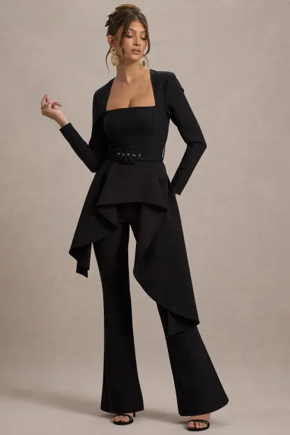 Defined by its sleek lines and sophisticated details. Eminent is a bold choice for your next special occasion. Crafted from our premium crepe. this black jumpsuit features a striking square neckline that enhances your décolletage. while the flared-leg silhouette exudes modern elegance. The draped waist adds a touch of refined drama. creating a flattering and polished finish. Perfect for evening events or cocktail parties. keep Eminent in focus with minimal jewellery and statement heels for a look that is effortlessly chic and undeniably powerful.