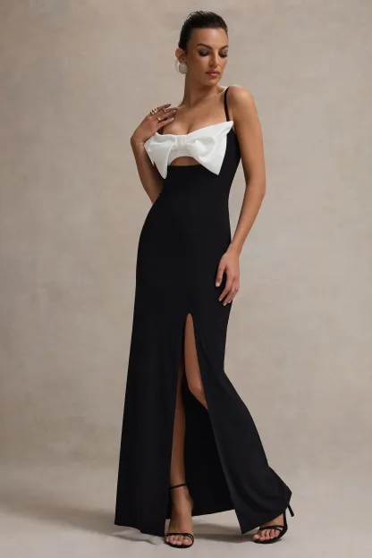 Indulge yourself in luxury this event season in Emmalou. our charming maxi dress. Carefully crafted in our signature stretch jersey. this black maxi boasts a subtle chest cut-out. adjustable cami straps and high-leg split. A contrasting white bow bralet is the star of all features. making this the perfect statement piece for that special occasion.