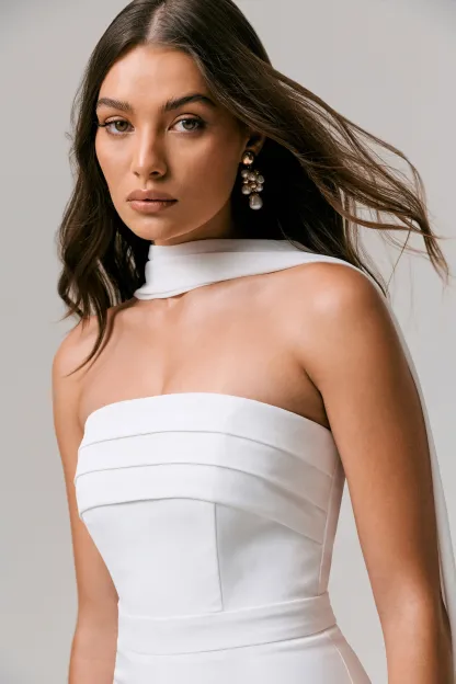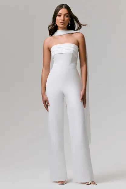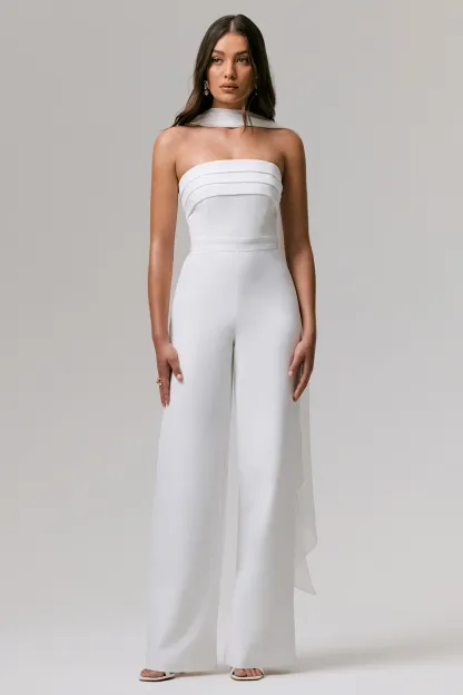Sophisticated with a touch of drama. Enchanted is tailored to flatter and command attention. Cut from our premium white crepe. this striking jumpsuit redefines occasion dressing with clean lines and elevated detail. The pleated bandeau neckline adds sculptural elegance. beautifully contrasting the chiffon wrap scarf detail that brings soft. delicate movement. Enchanted is your go-to for bridal moments. elegant dinners. or an all-white dress code done right.