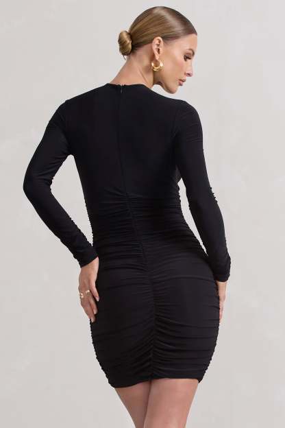 Escapism Black Ruched Long-Sleeve Cut-Out Mini Dress