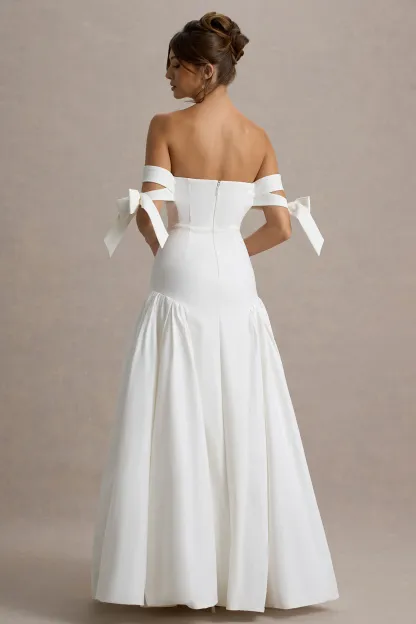 White & Cream Bardot Maxi Dress With Volume Skirt