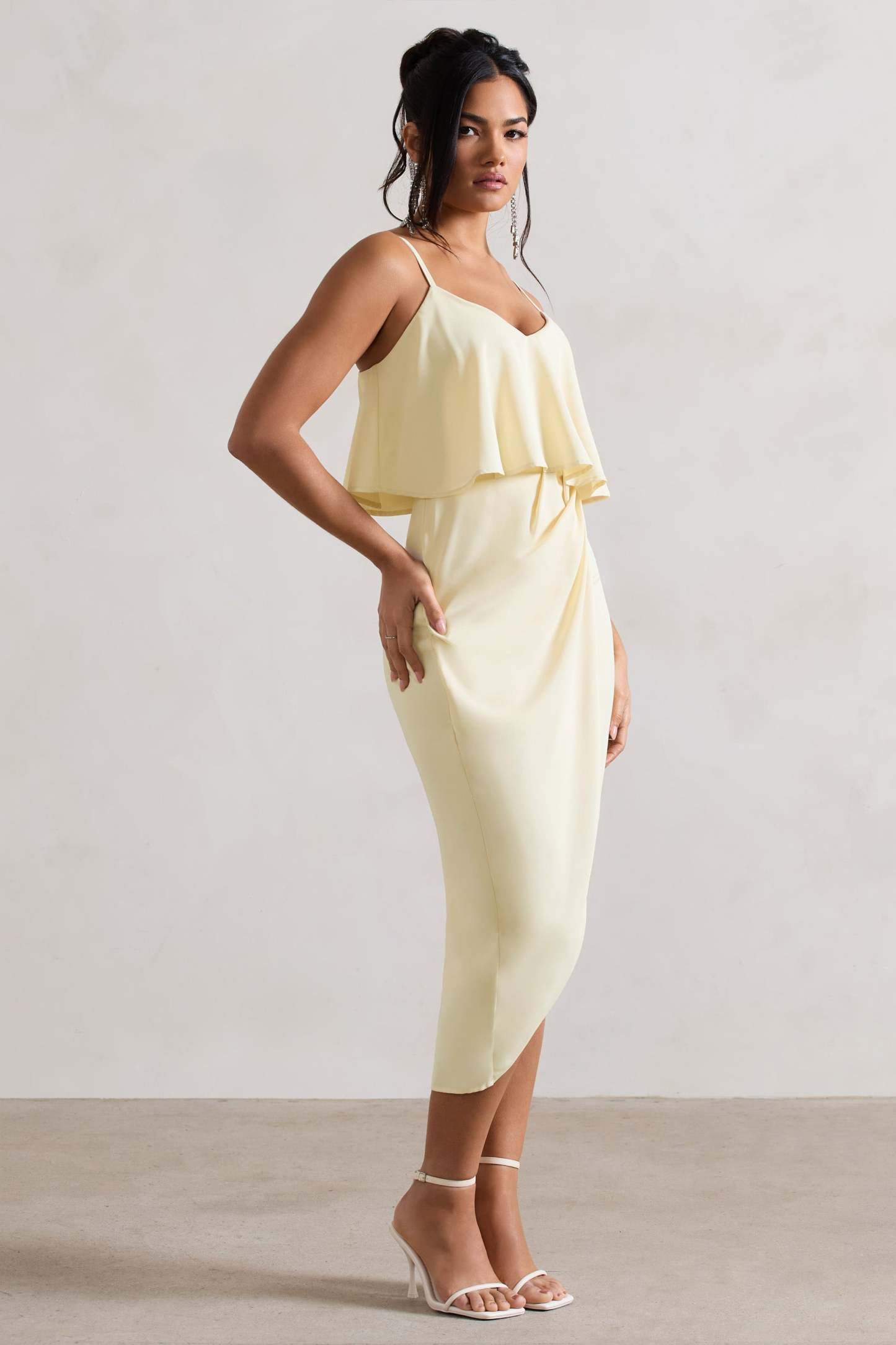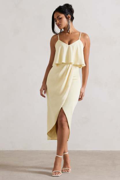 Destination wedding guest? Say hello to Faro. Our lemon wrap midi dress crafted in our premium crepe. detailed with a light draped neck and flattering wrap skirt. For your next occasion try styling Faro with strappy sandals and a tousled bun for effortless elegance.