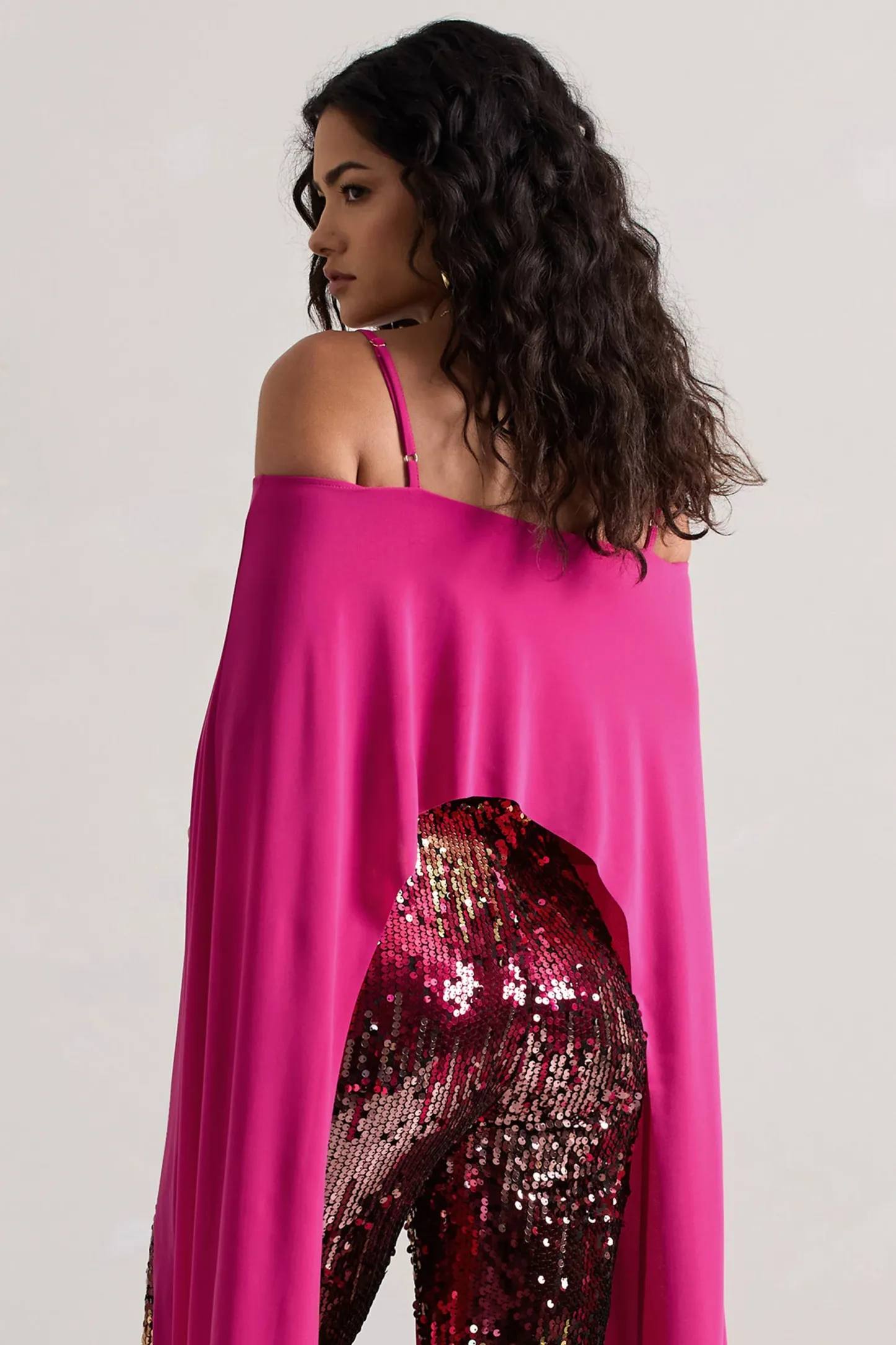 Get festival ready this summer with Floyd. our dark pink crop top. With exaggerated cape sleeves. this statement piece is sure to turn heads. Team yours with our pink and gold sequin flares Carnival for a bold look at your next event.