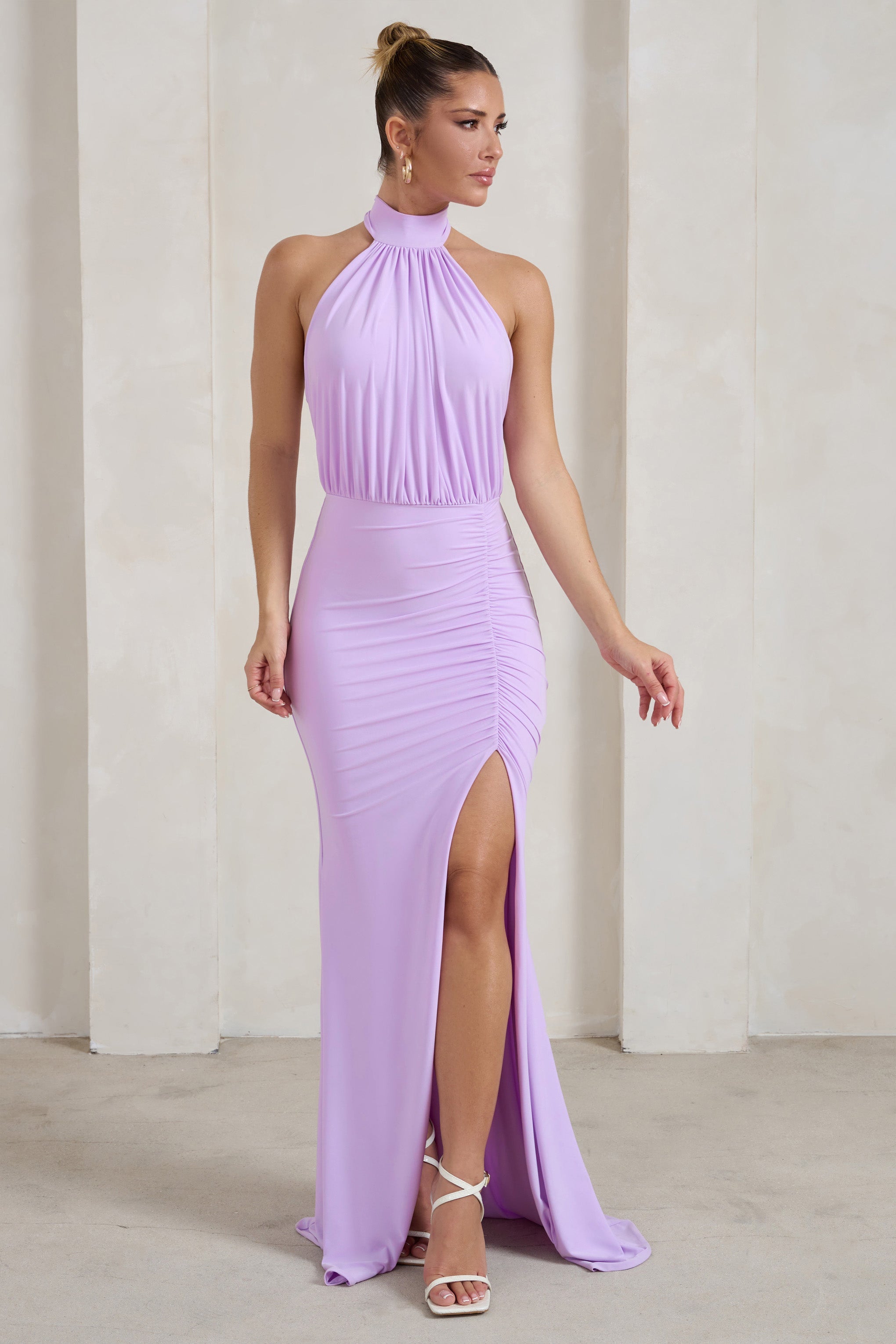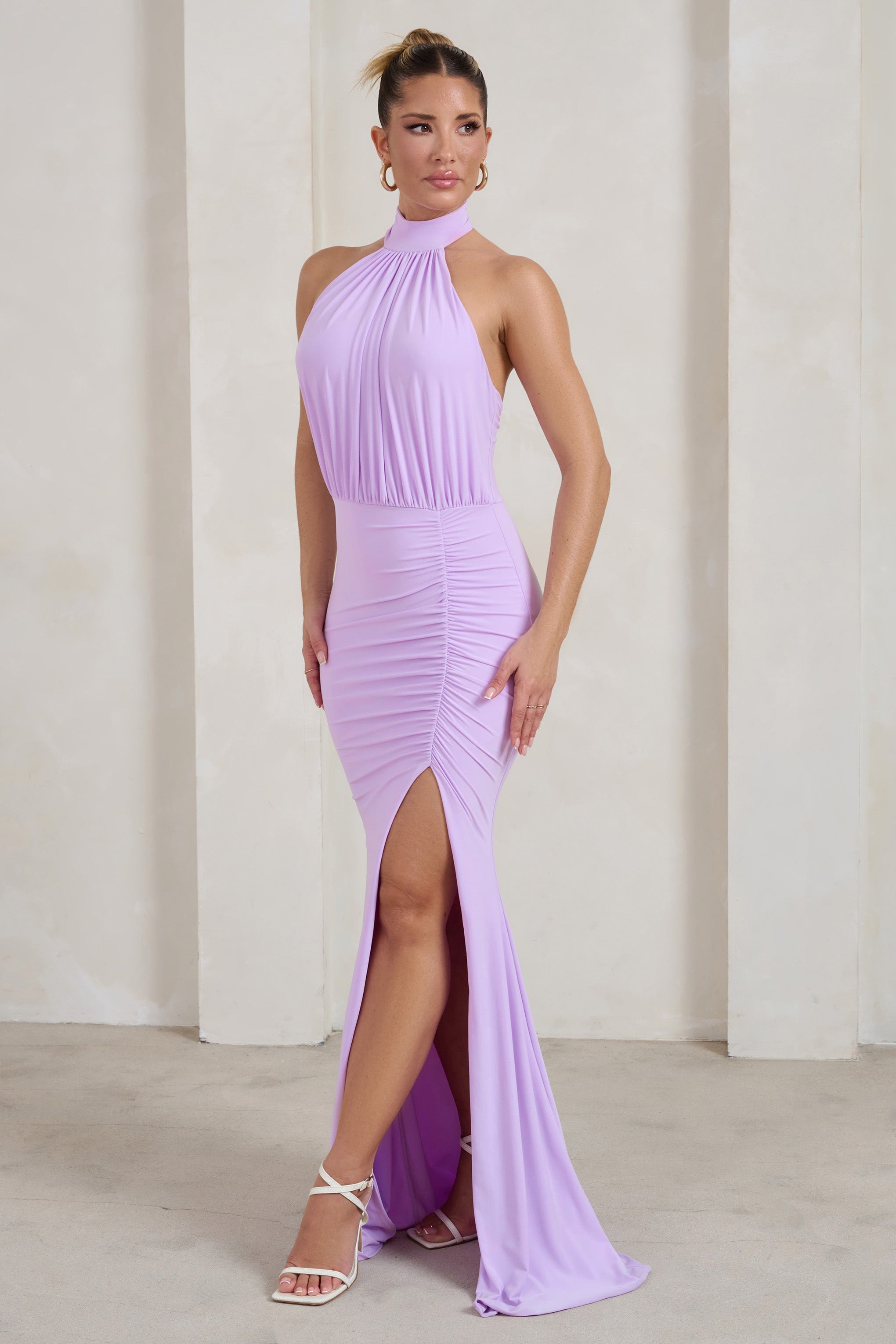 Dreamlike in both design and name. our Forever Dreaming maxi dress will leave onlookers enchanted. This pale lilac option is constructed from premium ruched jersey with plenty of stretch to contour every curve. Perfect for weddings or your highly-anticipated prom night. the sleeveless dress boasts a high halter neck. an open back and a split fishtail skirt.