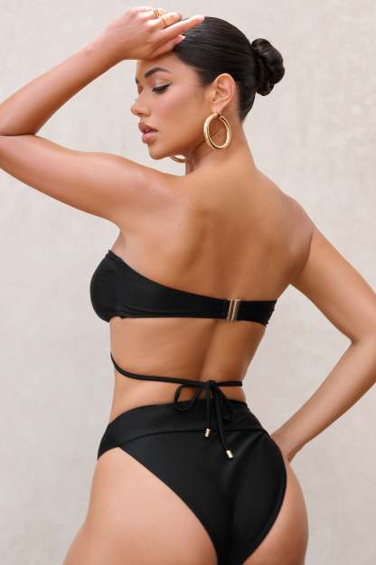 Our beach staple Freyr is both comfortable and eye-catching with a gold-toned metal ring placed proudly between each padded cup. Designed in a black nylon knit. this bandeau bikini top is finished with wisp laces and a classic swan hook fastening.
