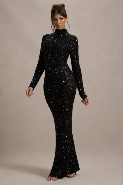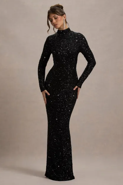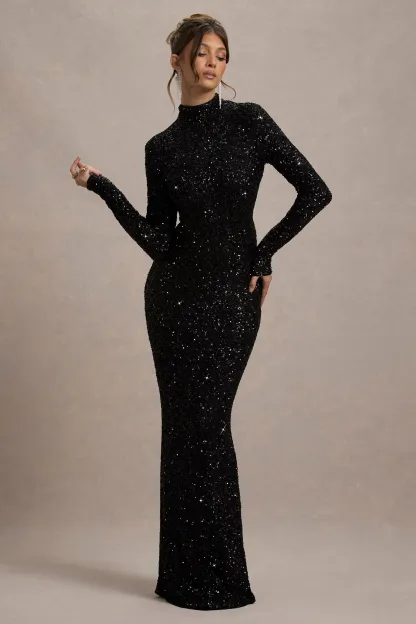 Black Sequin Turtle-Neck Long-Sleeve Maxi Dress