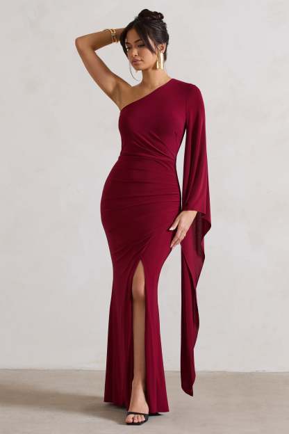 Giada Berry Ruched One Shoulder Cape Sleeve Maxi Dress