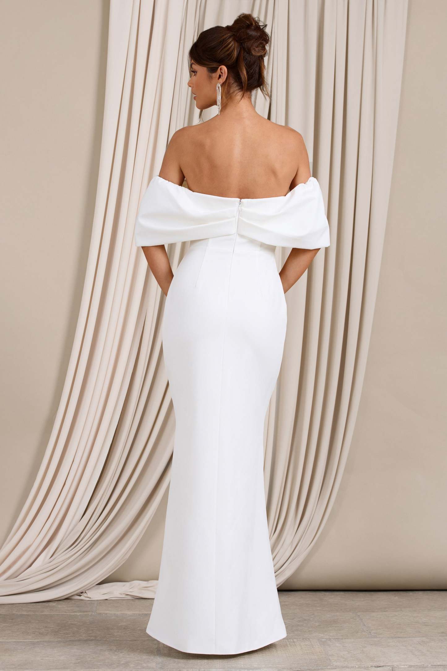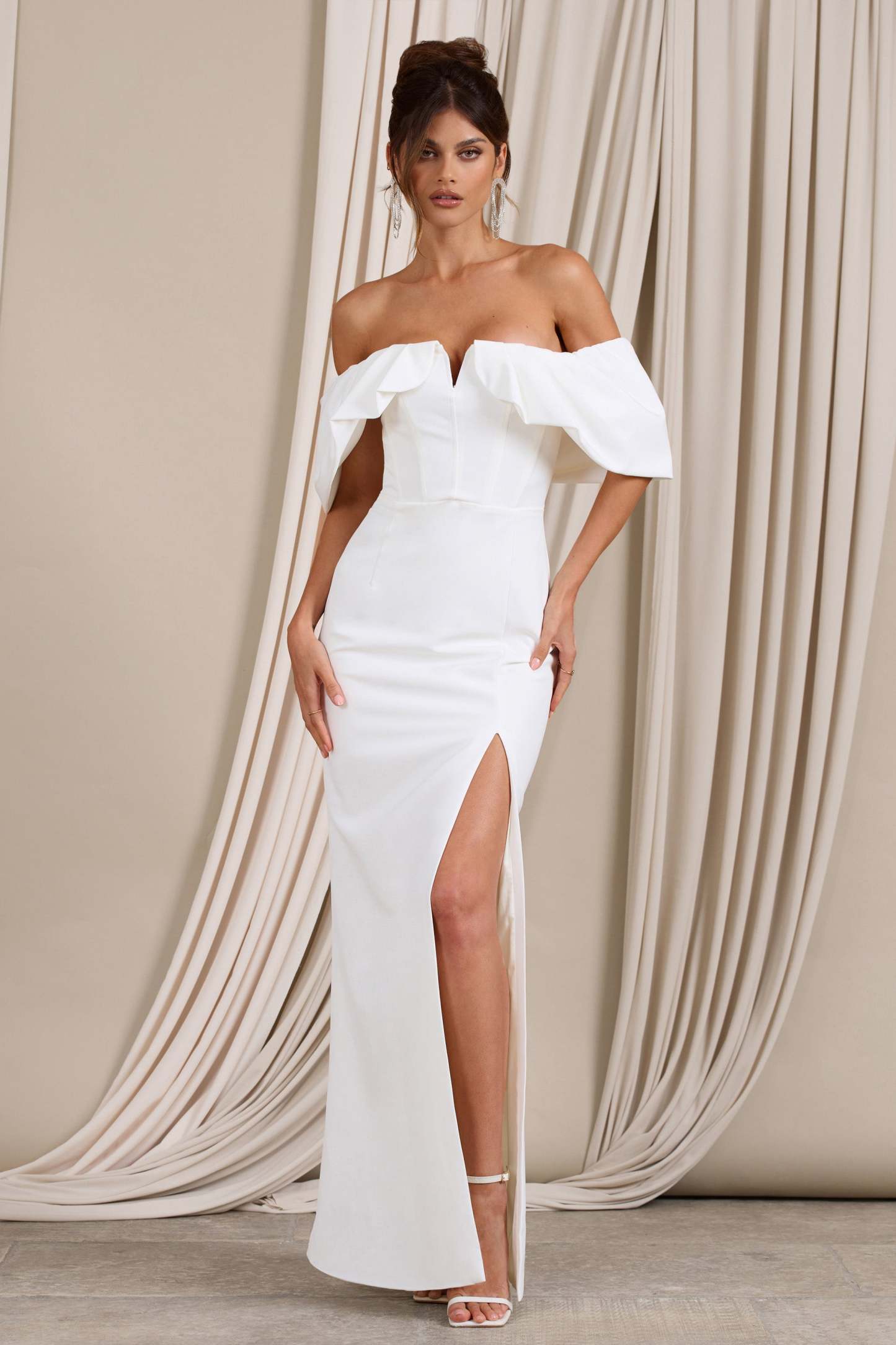 For a classic wedding dress that caresses your curves. look no further than our gorgeous Graces. Designed in a luxurious stretch crepe that sculpts your figure effortlessly. this white maxi dress features a Bardot neckline wrapped by voluminous short sleeves and a thigh high split for those wedding reception dances.