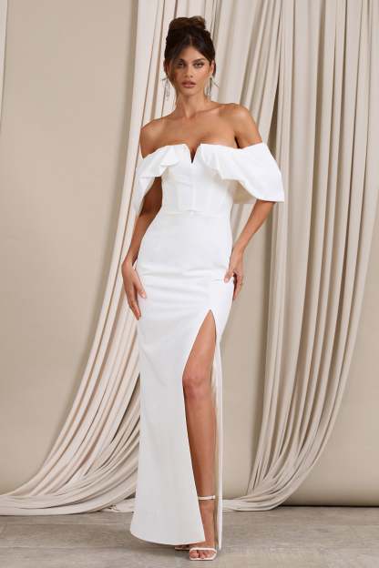 Graces White Structured Bardot Split Maxi Dress