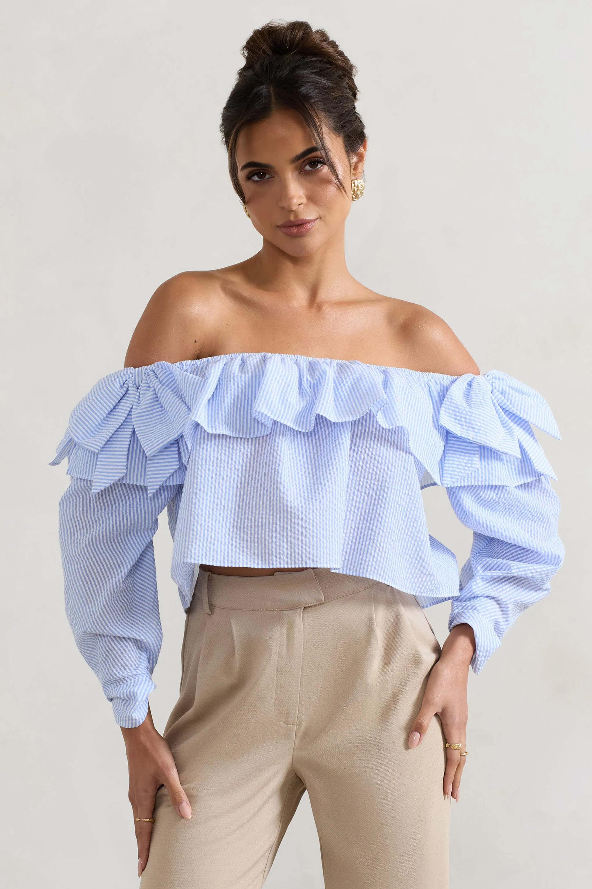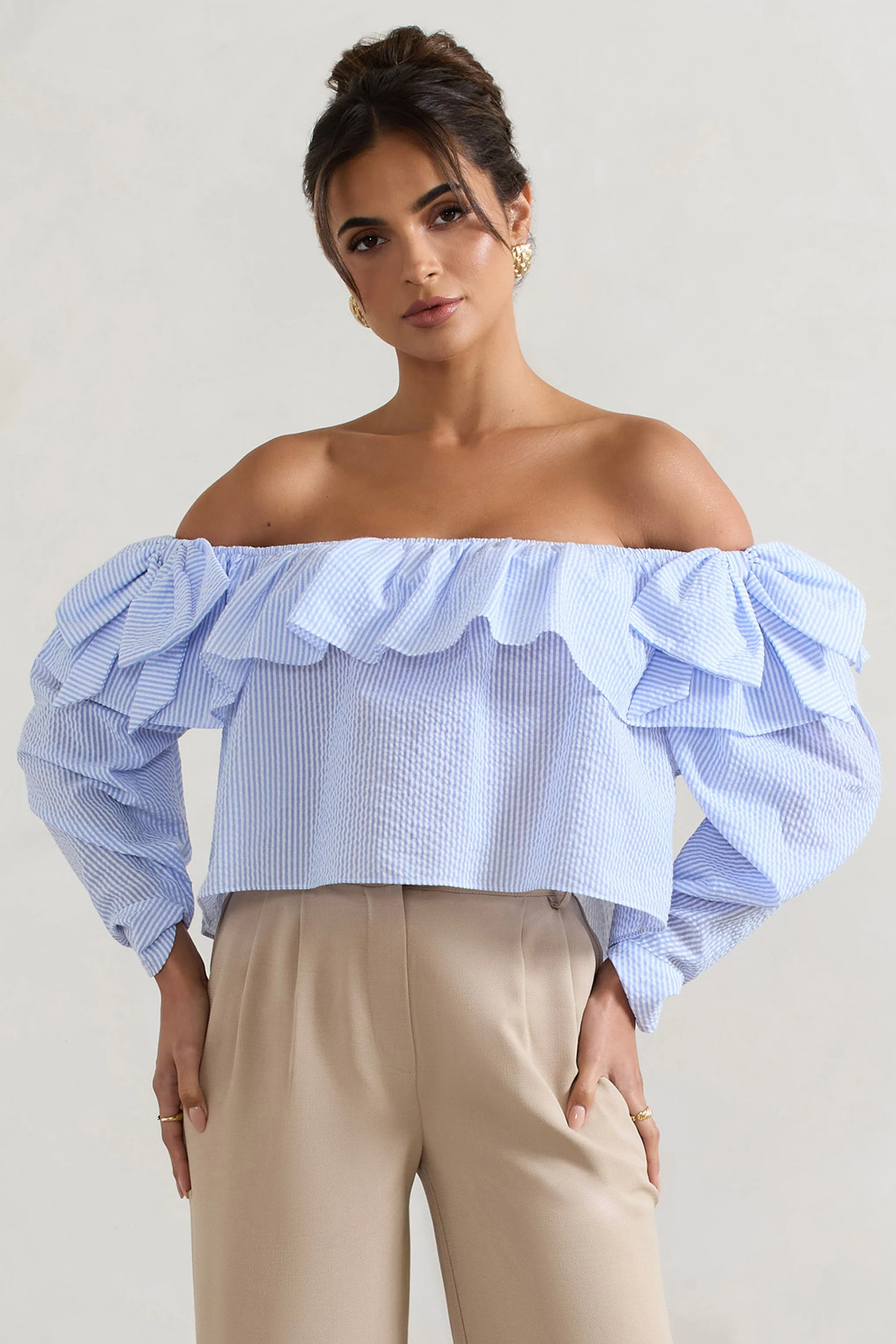 Blue Pinstripe Bardot Puff-Sleeve Top With Bows