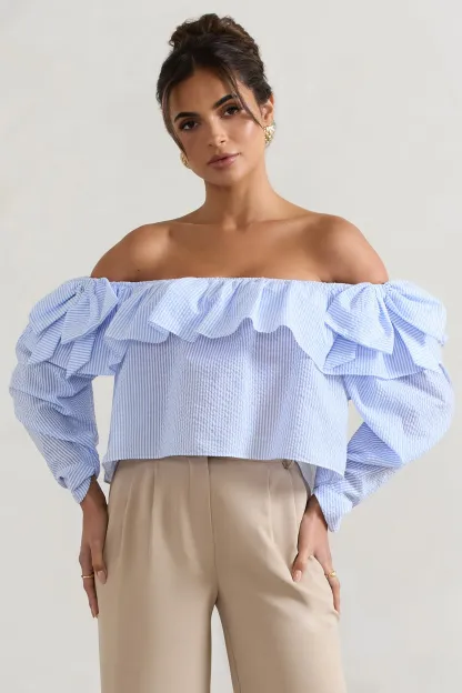 Designed in a crisp pinstripe that holds a breezy. slightly loose shape. Harbour is a summer essential. Boasting an elasticated bardot neckline topped with feminine bows. show off all this blue top has to offer by styling yours with a sleek bun and some simple hoop earrings.