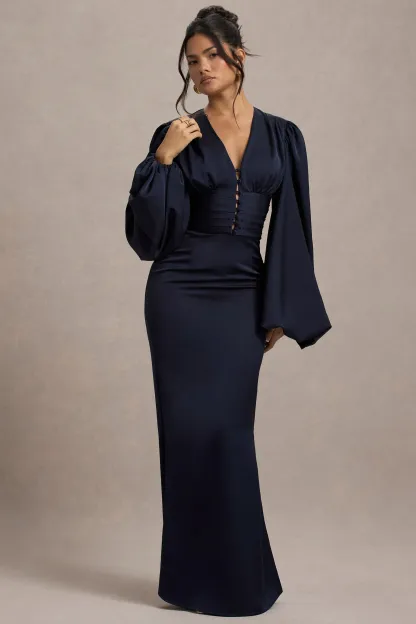 Navy Satin V-Neck Balloon Sleeve Maxi Dress