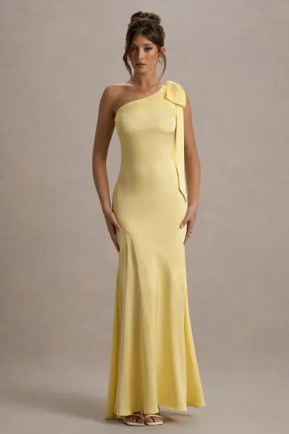 Pale Lemon Satin Asymmetric Maxi Dress With Bow