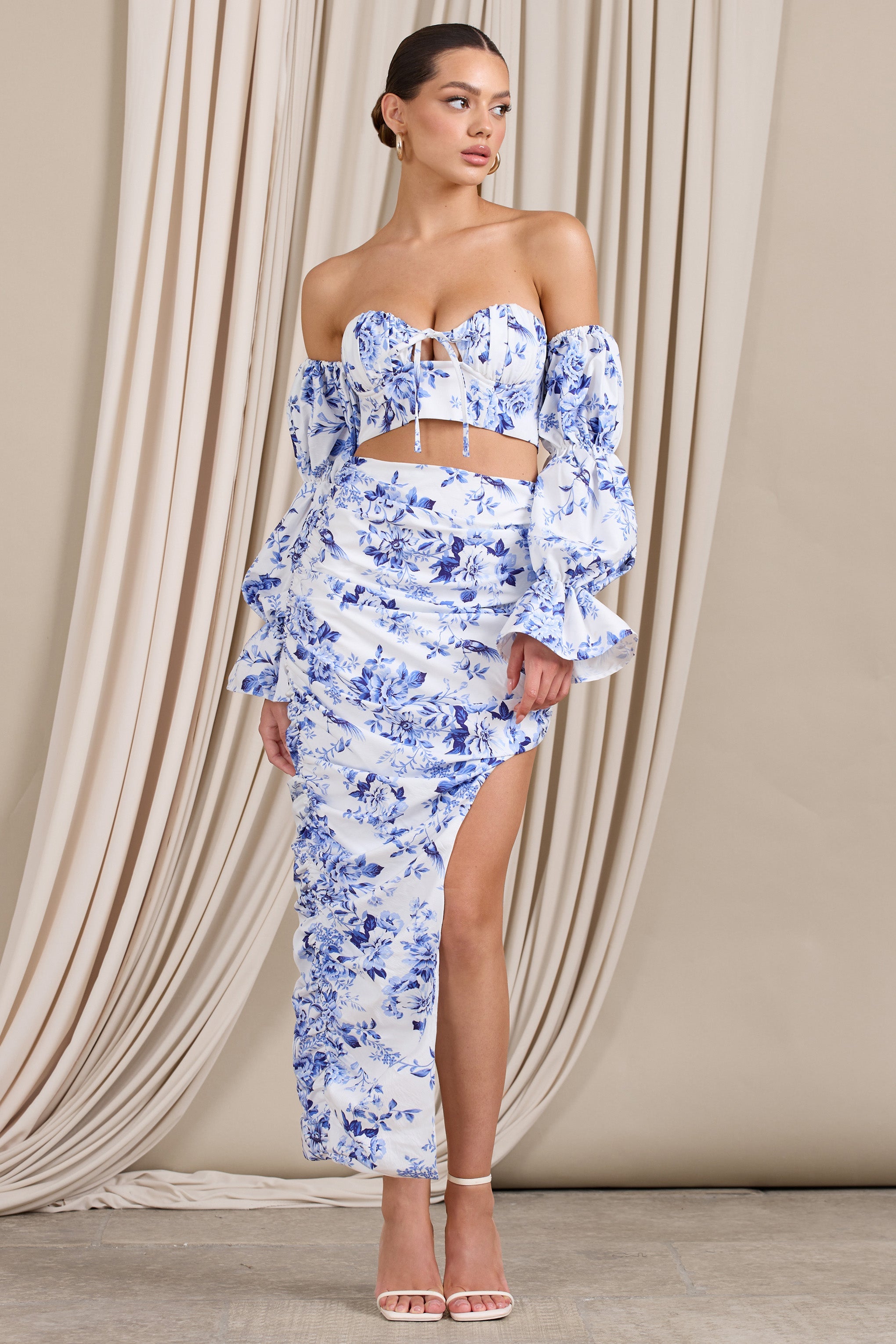 Holiday Blue Floral Ruched Asymmetric Maxi Skirt