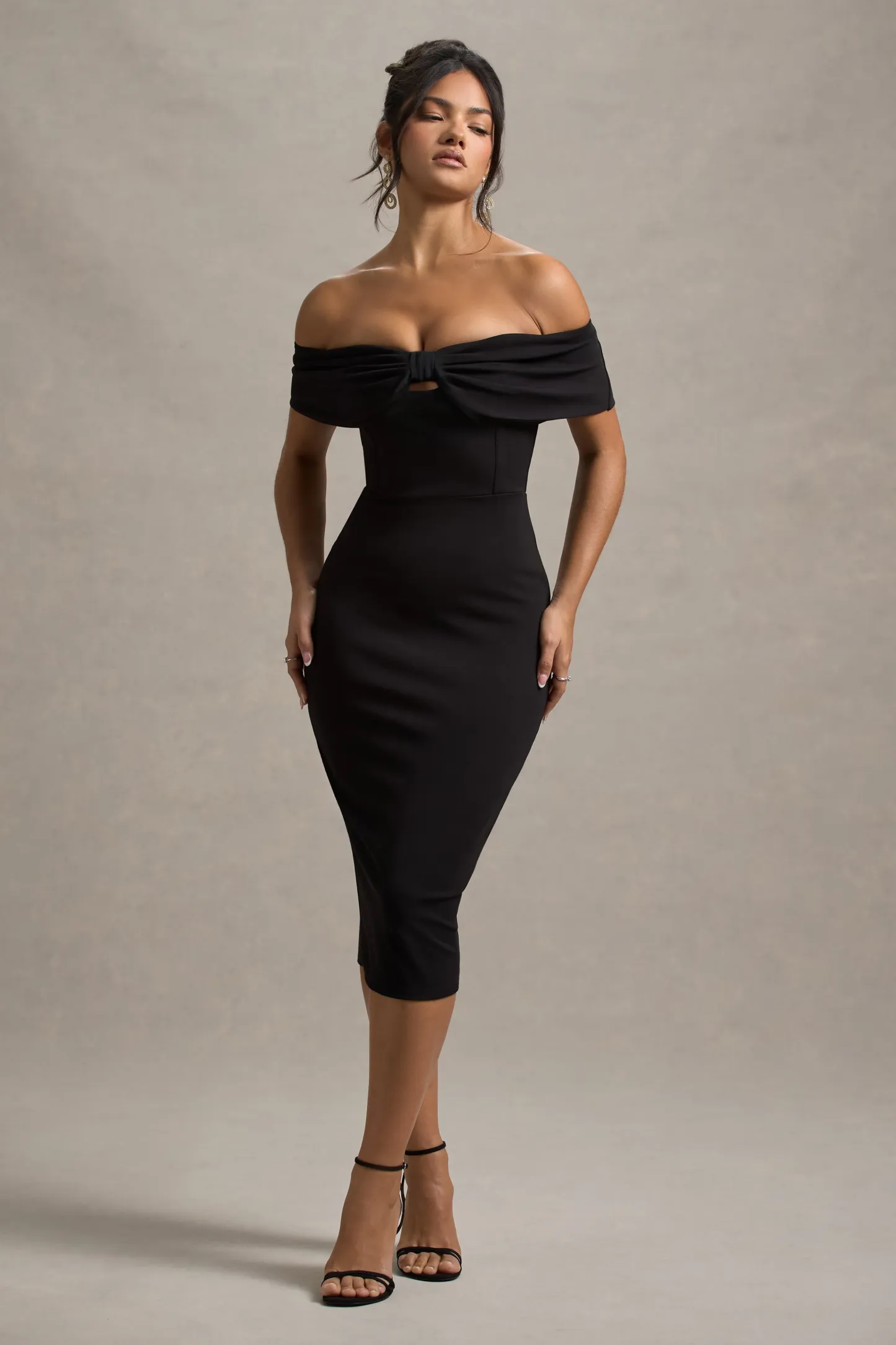 Elevate your date night wardrobe with a midi like Hope. Crafted in our signature scuba crepe to fit you like a glove. this navy dress showcases a feminine bow bardot thats highlighted by a chest cut out. A stand out staple. style yours with some gold stilettos like Crossed Wires for an elevated evening look.