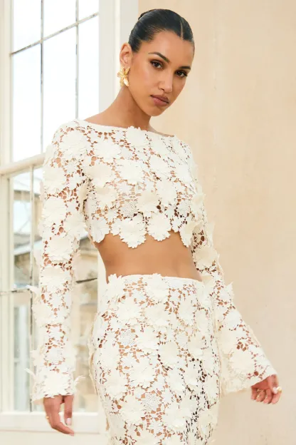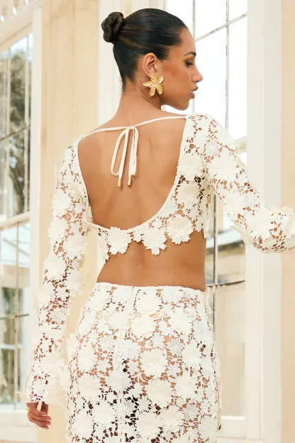 Look effortlessly chic all summer long in our Ibiza crop top. Designed in our premium lace. in a classic white shade that'll compliment your sun-kissed skin beautifully. this is the perfect piece to style over and over again this season. Cut with an elegant boat neckline and an alluring scoop open back that adds a daring edge to this piece. The romantic bell sleeves are the perfect finishing touch to this top. Style with our Kingston skirt and sleek sunglasses. for a look that'll take you from beach club lunches to sunset cocktails.