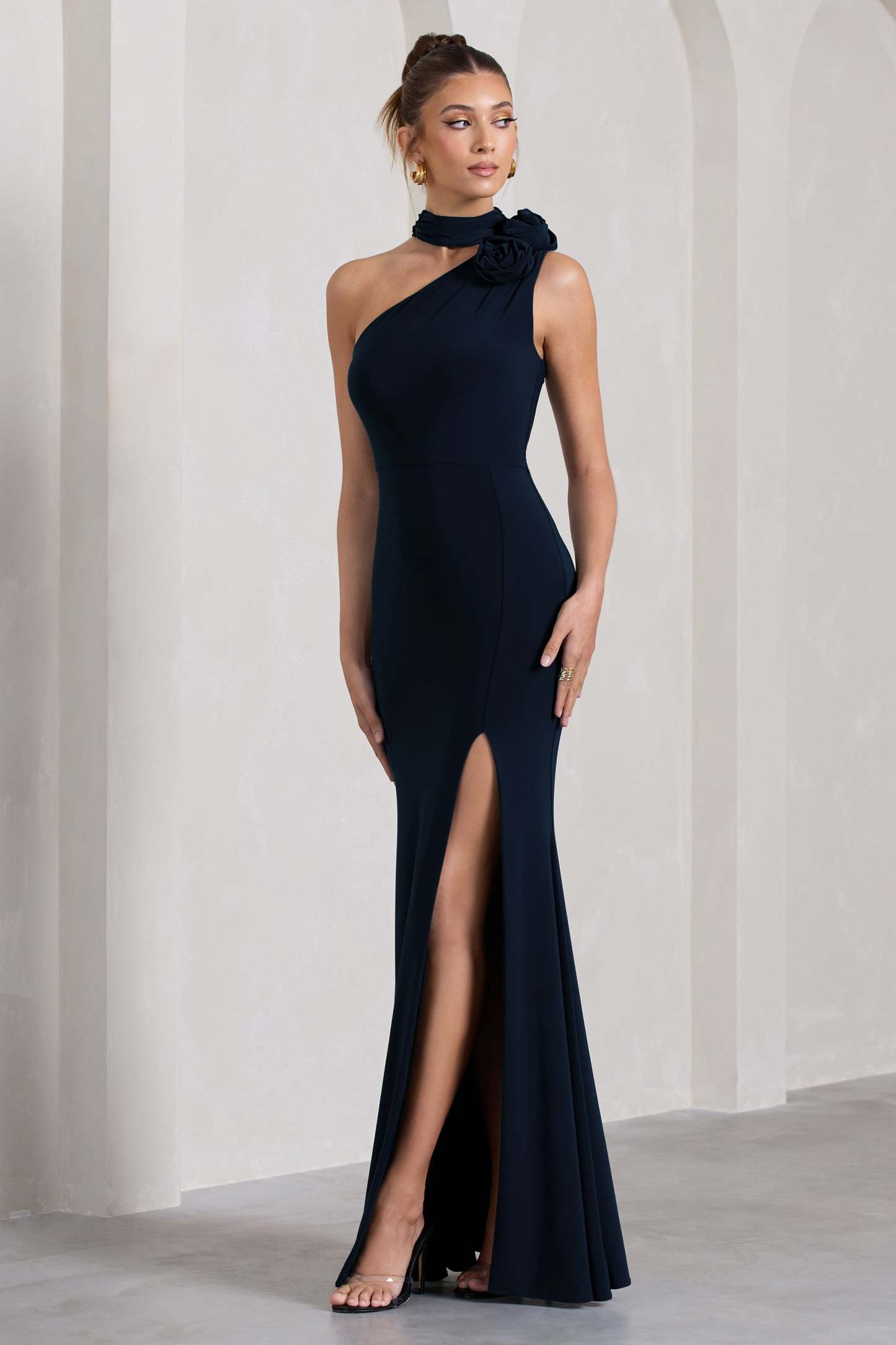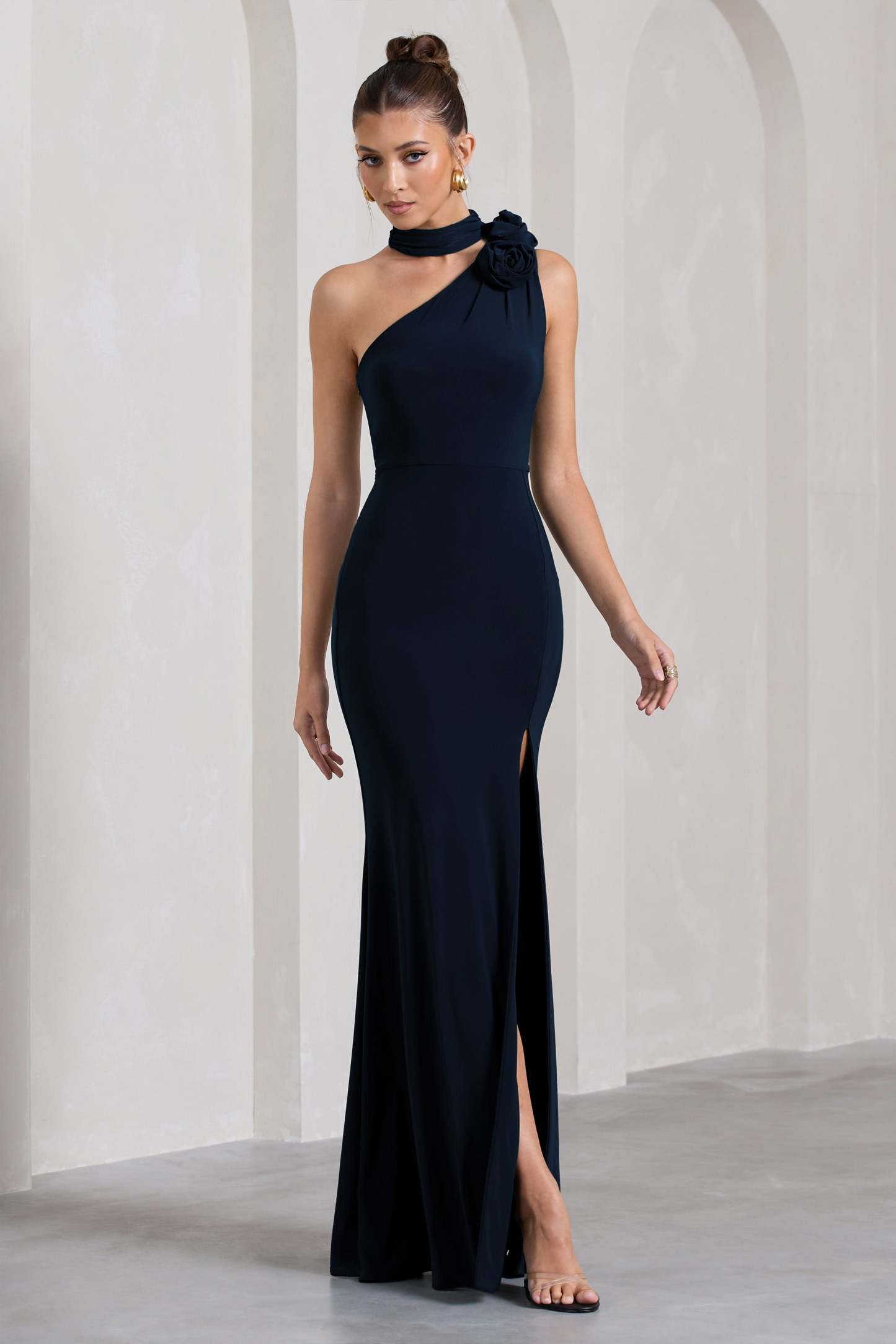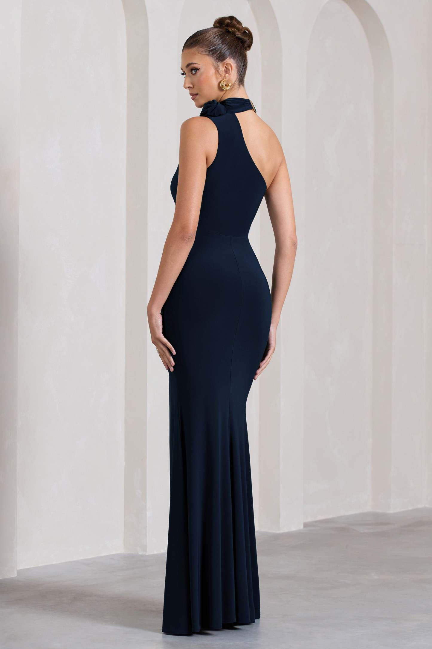 In Suspense Navy One Shoulder Halter-Neck Split Maxi Dress With Flower