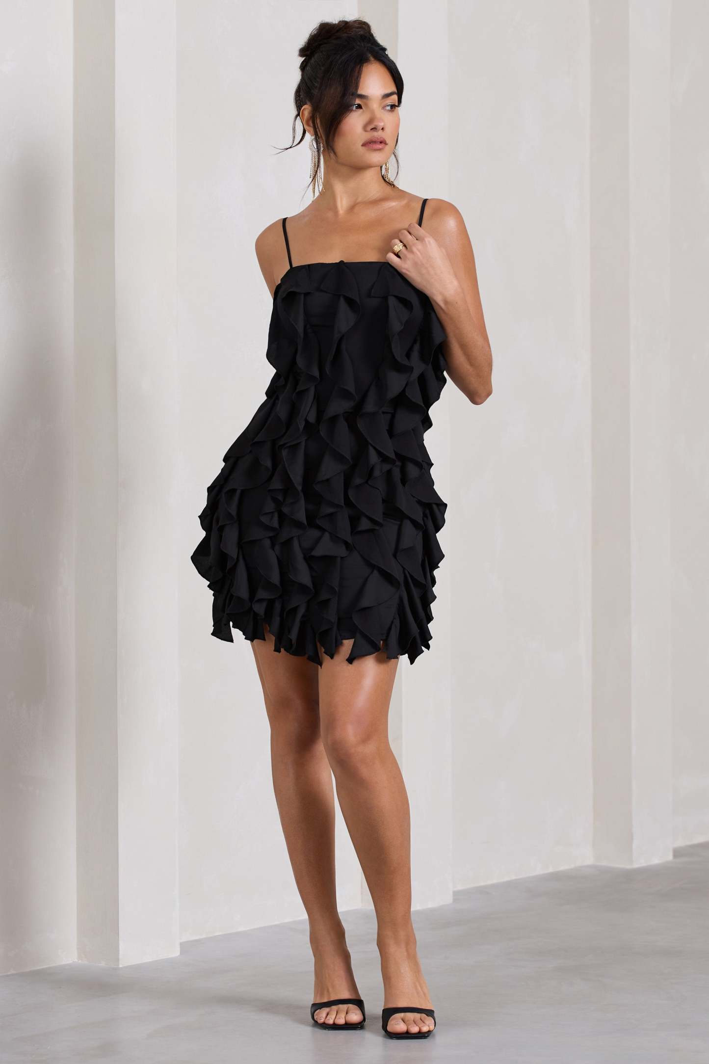 Exude a romantic state of mind at your next social event in this strapless mini It Girl. Crafted in a classic black shade. this bodycon is defined by an array of high impact ruffles that create an effortless draping effect across its hemline. Accompanied by a pair of strappy stilettos. this LBD would make the perfect birthday ensemble.