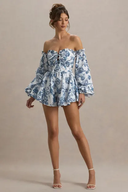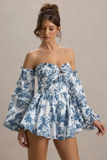 Blue Porcelain Print Bardot Ruffled Playsuit