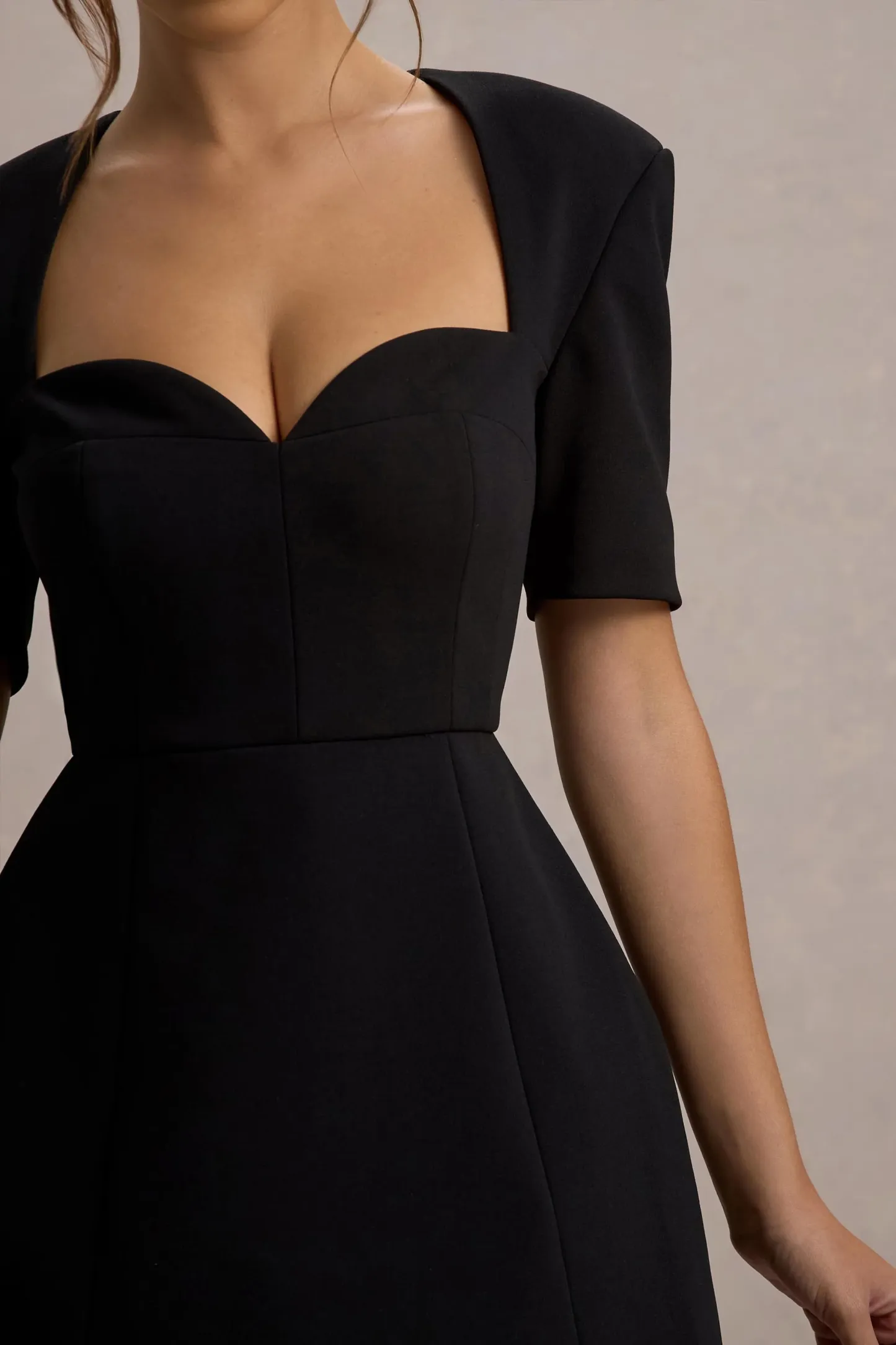 Johanna is a refined mini dress that promises to make a statement at any occasion. Crafted from our premium crepe. this LBD features a timeless sweetheart neckline that frames your décolletage. while its fitted silhouette enhances your natural curves. The short sleeves add a touch of elegance. and the tailored design ensures a sleek. sophisticated finish. Whether it's a cocktail party or a night out. Johanna is your go-to for effortless glamour.