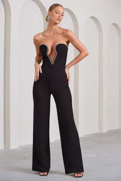 Sparkle under the party lights in our diamante-embellished Julia jumpsuit. Cut in a striking silhouette with a plunging neckline and long wide legs. this black jumpsuit is a true showstopper perfect for every evening occasion from birthday drinks to grand wedding receptions.