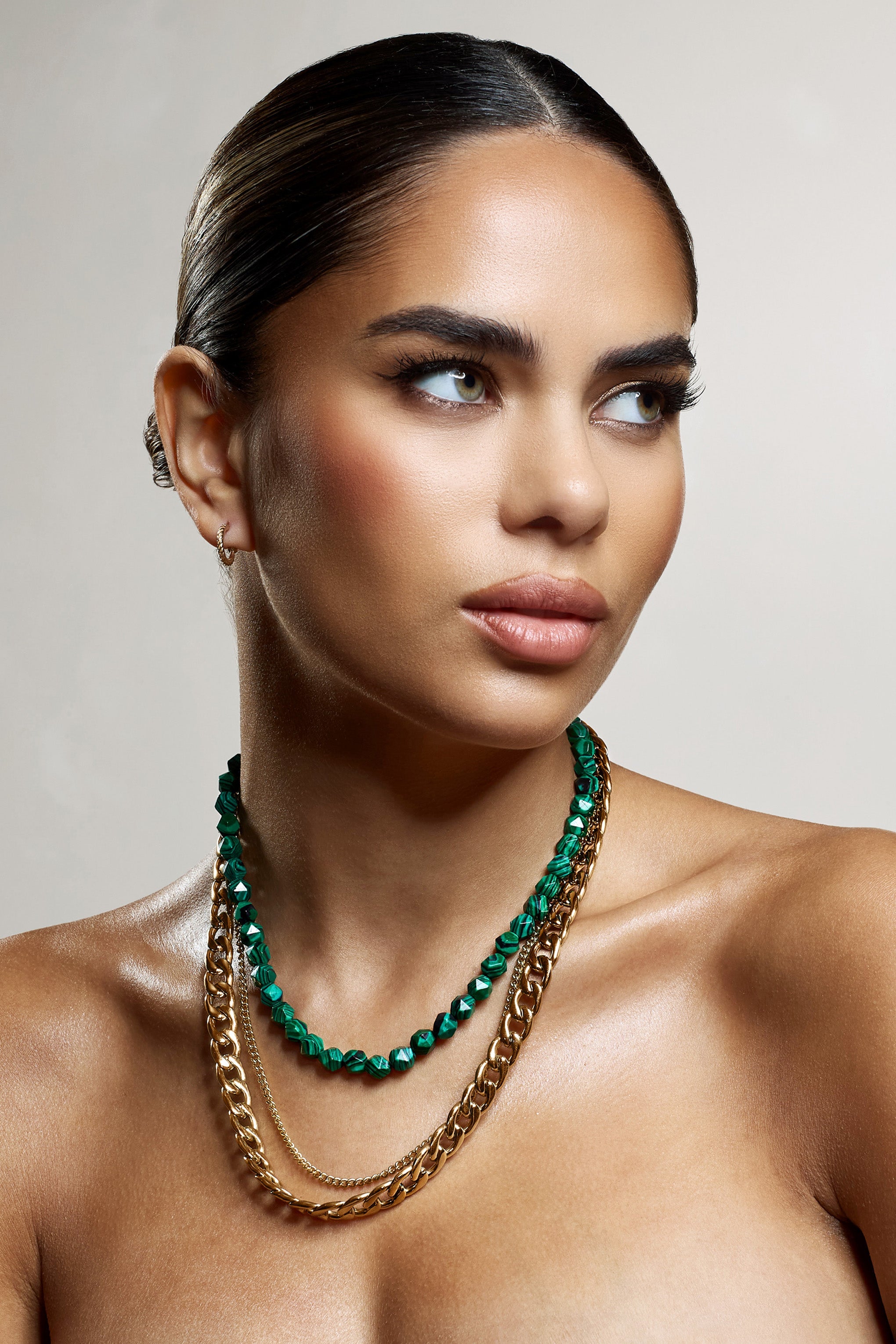 Add some versatility to your jewellery collection with Juni. our three piece gold necklace. Adding an element of colour is a green beaded element. which can be worn on its own or part of the set.