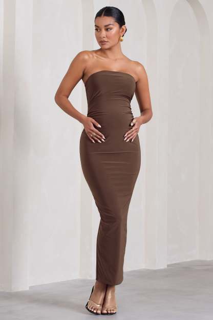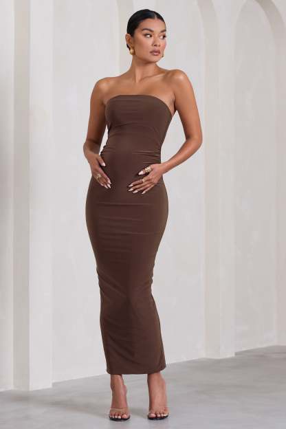 Tasteful and effortless. Juniper is the definition of the quintessential maternity dress. Crafted in a chocolate brown shade of our signature stretch jersey. this curve-hugging maxi dress showcases a minimalistic silhouette. Try styling this bandeau maxi dress with a sleek bun to show off your stunning décolletage.