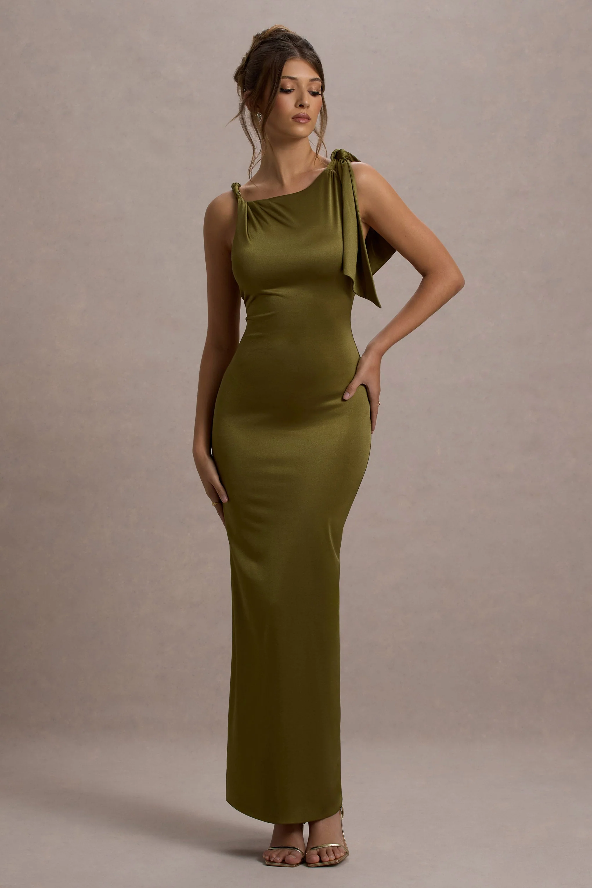 Captivate crowds in Kacey. our timeless maxi dress. Arriving in a deep olive shade of our premium jersey renowned for its sculpting abilities. this curve-enhancer is defined by contemporary twisted shoulder straps. Complete with a floor-sweeping skirt. Kacey is proof that simple silhouettes can have the most impact.