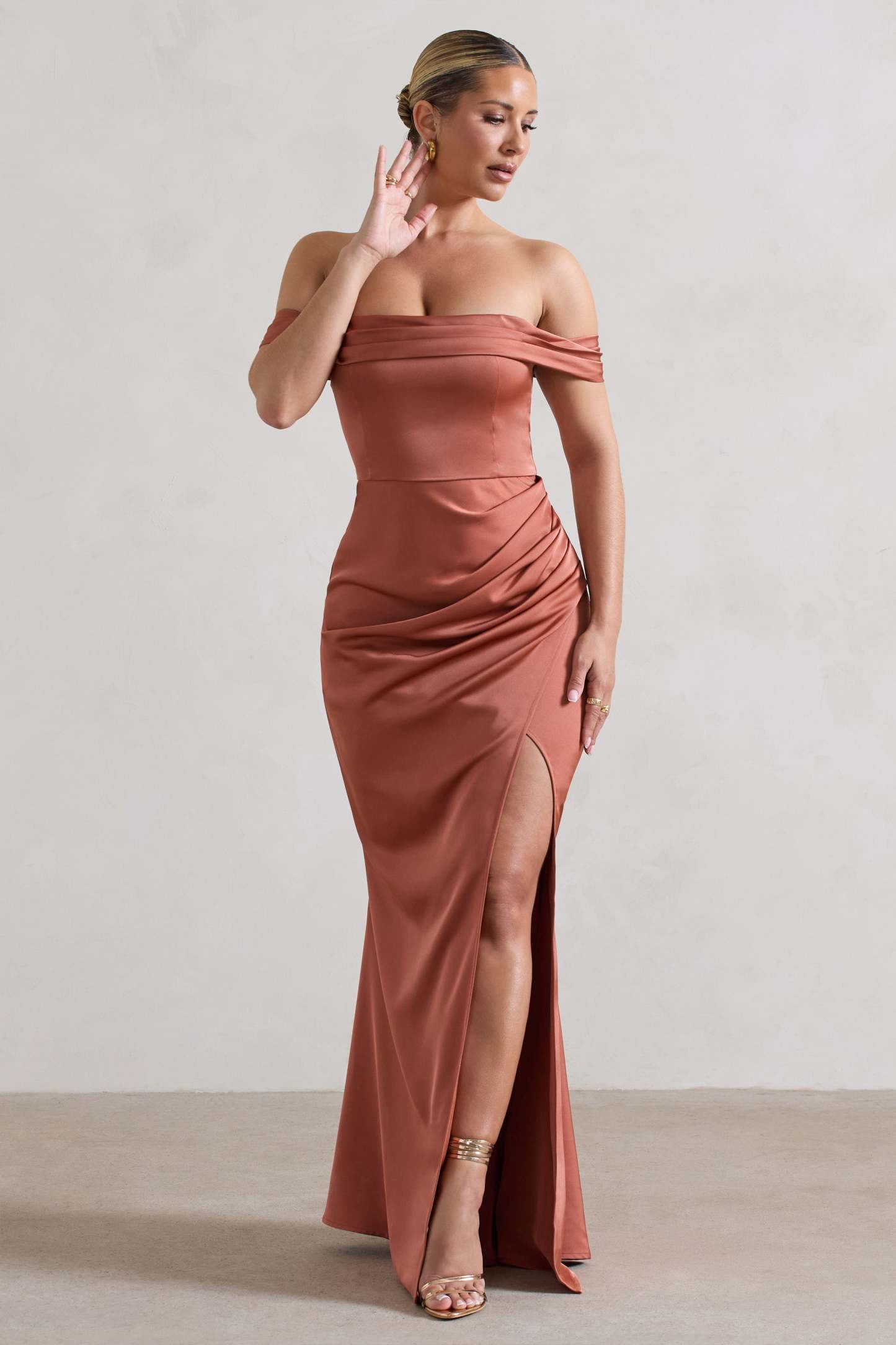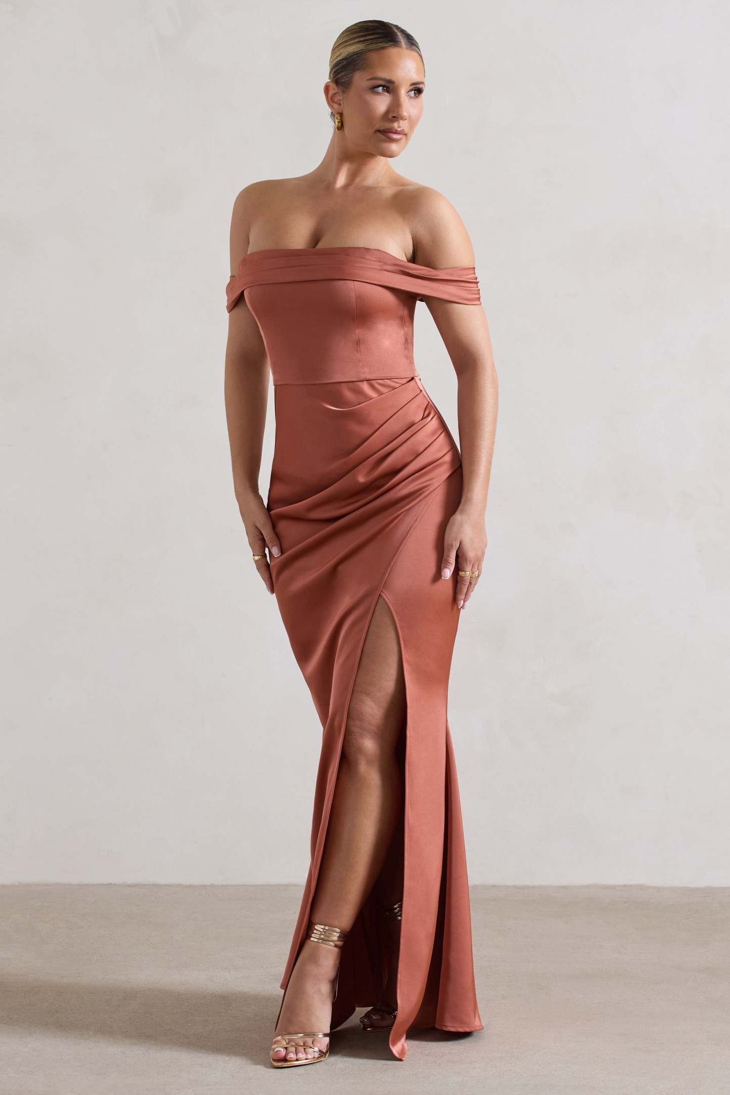 Leave a lasting impression at your next event in Katia. our rust toned maxi dress. Crafted in a luxurious satin. this timeless piece offers a draped bardot neckline and gathered skirt thats finished with a contemporary high leg split. For a graceful bridesmaid attire. team yours with some statement earrings and stilettos like Just A Fling.
