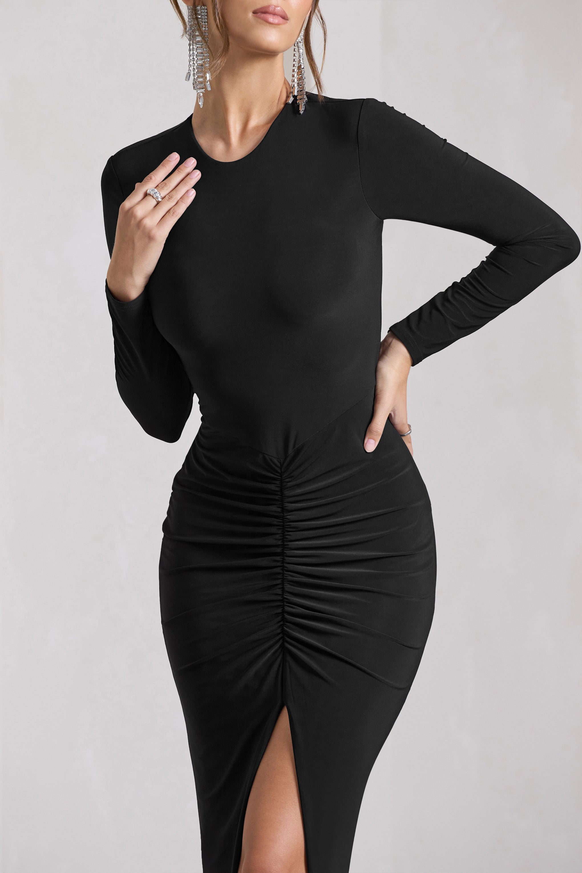 Katy Black Ruched Long-Sleeve Split Maxi Dress