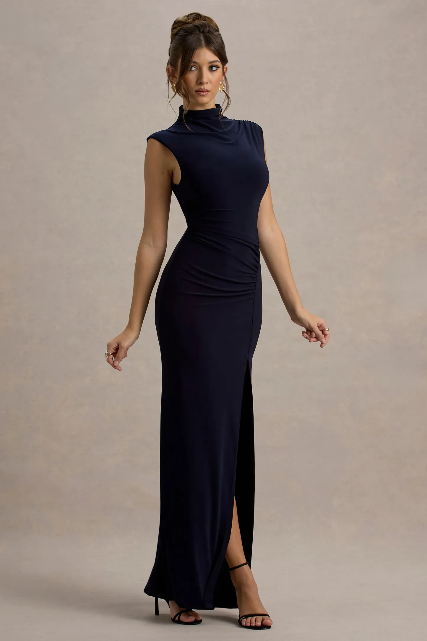 As flattering as it is flawless. captivate from all angles in Lanetta. Crafted in a navy shade of our premium jersey known for its stretch properties. this curve-enhancer boasts flattering ruching to cinch your natural silhouette. Further enhancing its charm is a delicately tucked high neckline and sultry leg split that's ensured to turn heads at your next event.