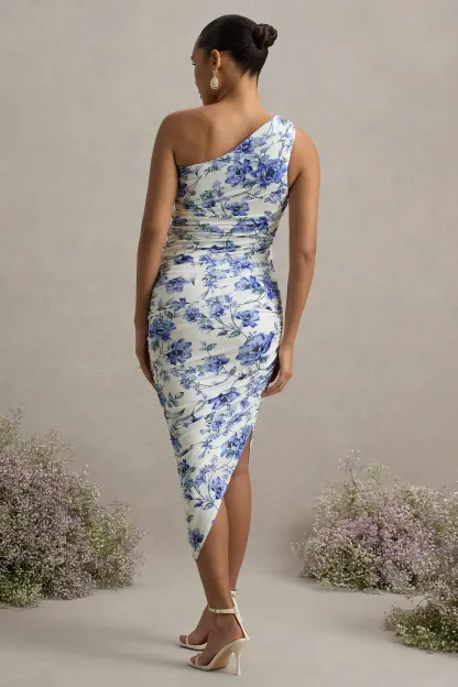 Blue Floral Print Maternity Ruched One Shoulder Midi Dress