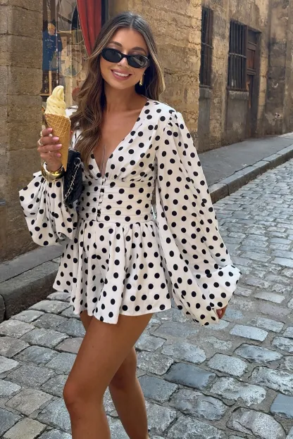 Made to be strolling through the streets of Sardinia is Laurel. our new white polka dot playsuit. This piece crafted in a lightweight woven fabric. showcases voluminous balloon sleeves that a ready to capture that summer swing. Laurel is detailed with a statement v neckline. cinched button up waist panel and flared shorts for a feminine fit.