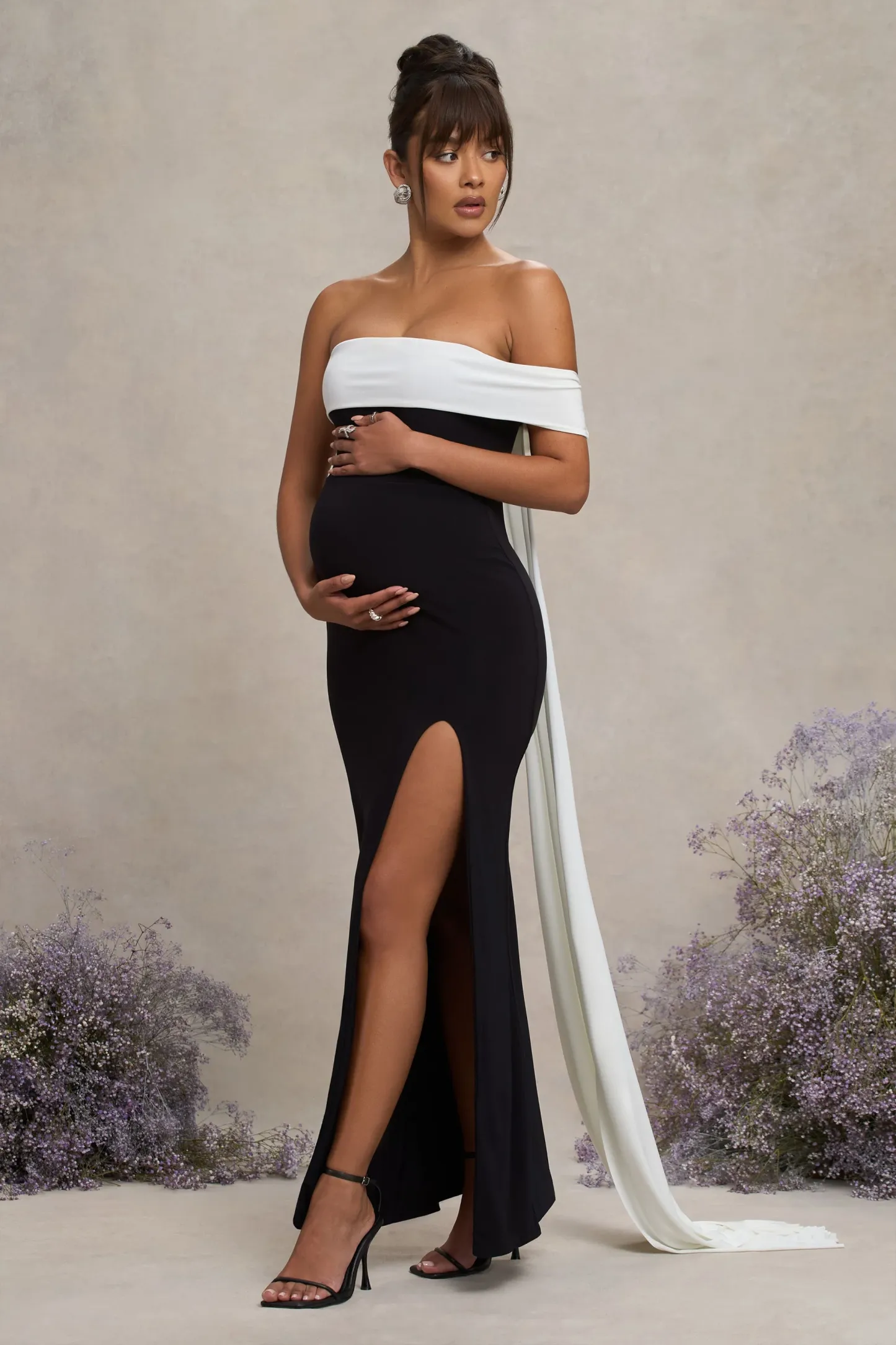 Black & White Bardot Split Maternity Maxi Dress With Drape