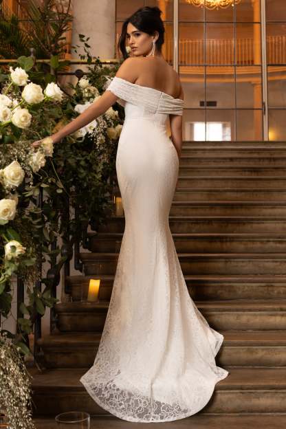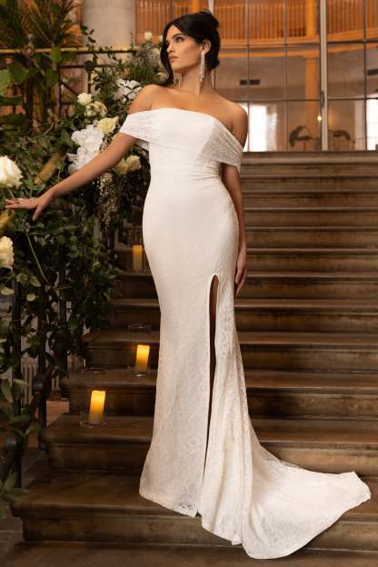 Classically cut and made to contour. Lilibet is the wedding dress for modern brides this upcoming season. Our white maxi dress is designed in sculpting stretch jersey and a layer of lace in the same soft white shade. Defined by a Bardot neckline. a structured bodice and a split fishtail skirt. this aisle option is one to be remembered.
