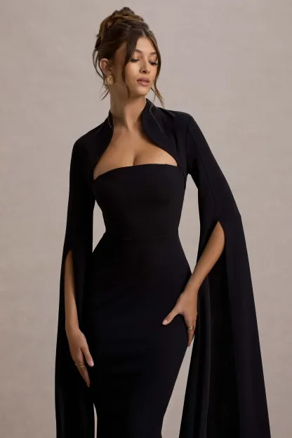 Black Bodycon Cape-Sleeve Midi Dress