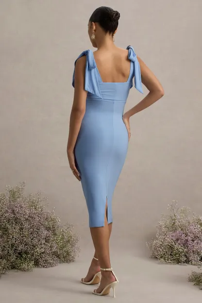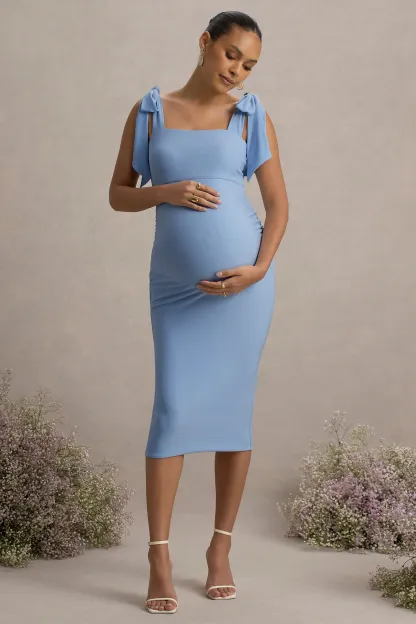 Powder Blue Square-Neck Maternity Midi Dress With Bow Straps