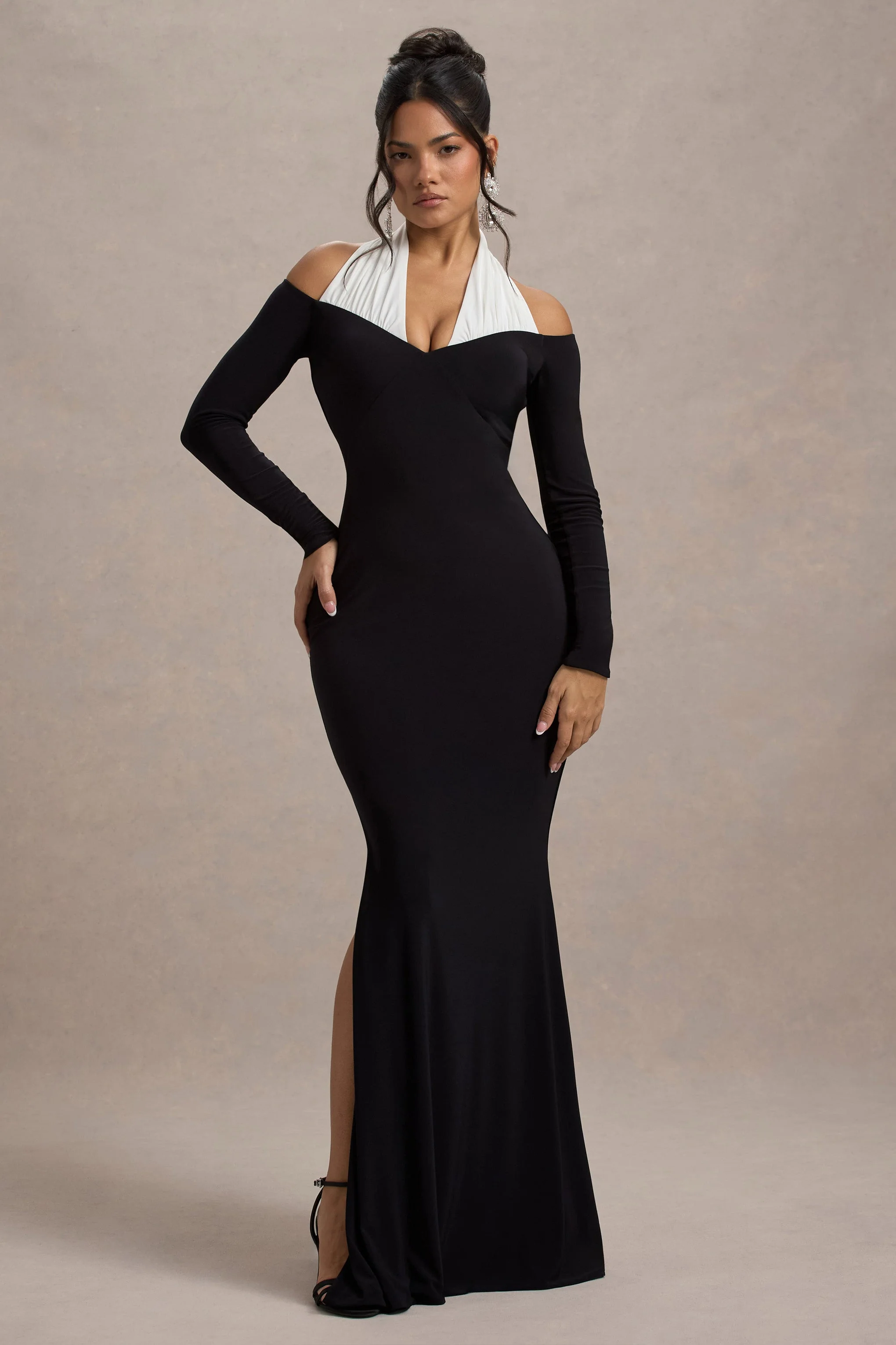 Black & White Halter-Neck Split Maxi Dress