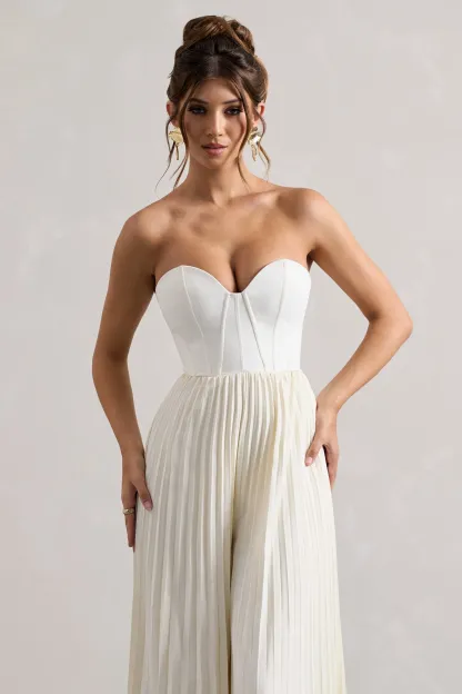 Cream Corset Plisse Wide-Leg Jumpsuit