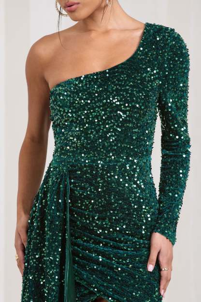 Lorena Bottle Green Sequin Velvet One Shoulder Mini Dress With Drape Detail