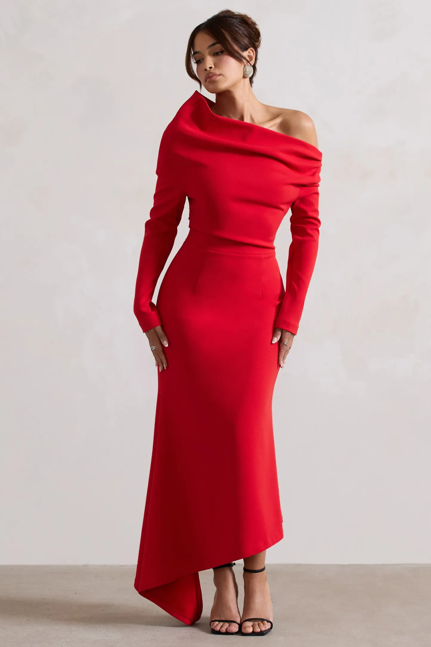 Embrace the wow-factor at every event in our latest red maxi Lou. Presented in a premium crepe. this elegant choice is detailed with a graceful bardot neckline and flouncy asymmetric hemline. Style Lou with a sleek bun for an iconic graduation look.