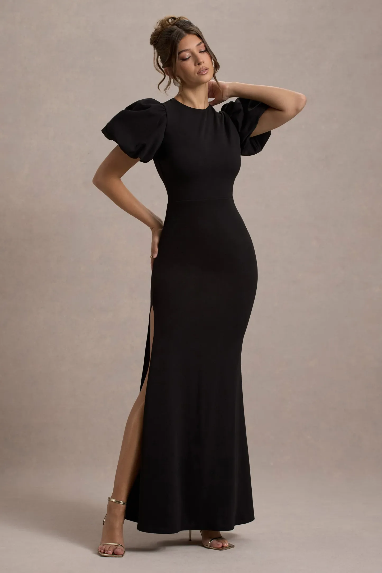 Exude a romantic state of mind in our aptly-named maxi. Love Letters. Crafted in a timeless black shade of our premium scuba crepe. this floor-sweeper boasts artful puff sleeves and a high-leg split. Compliment this occasion maxi by styling yours with some glistening gold accents.