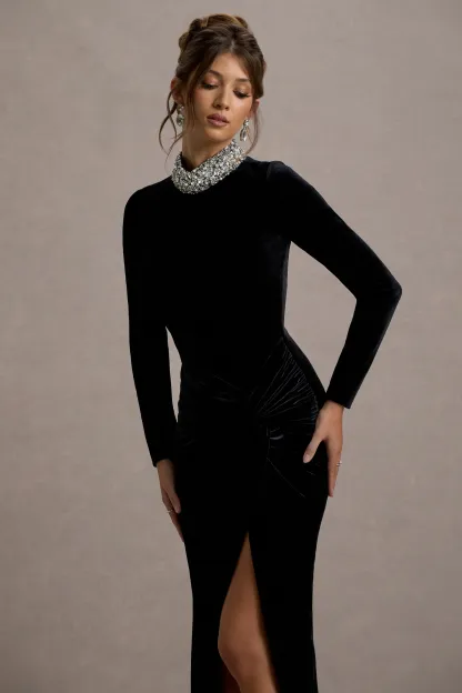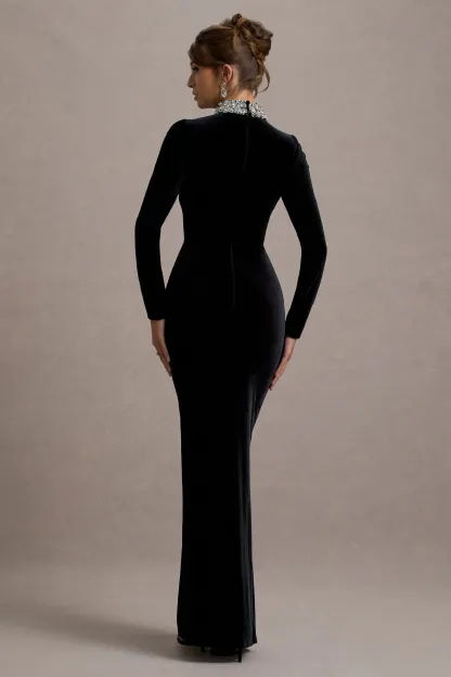 Black Velvet Embellished Twist Maxi Dress