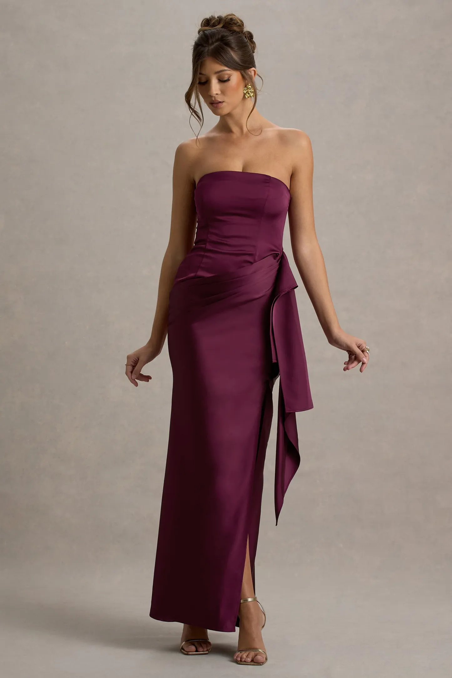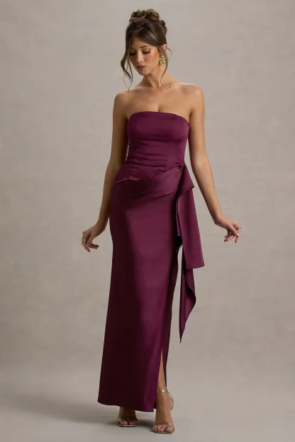 Defined by soft elegance and refined detail. Loz is a stunning choice for your most glamorous occasions. Crafted from our luxurious premium stretch satin in a burgundy hue. this maxi dress features a chic bandeau neckline that beautifully highlights the shoulders. The expertly draped silhouette flatters the figure. while the floor-length skirt adds a touch of timeless sophistication. Trying styling Loz with sparkling accessories for a look that exudes romantic charm.